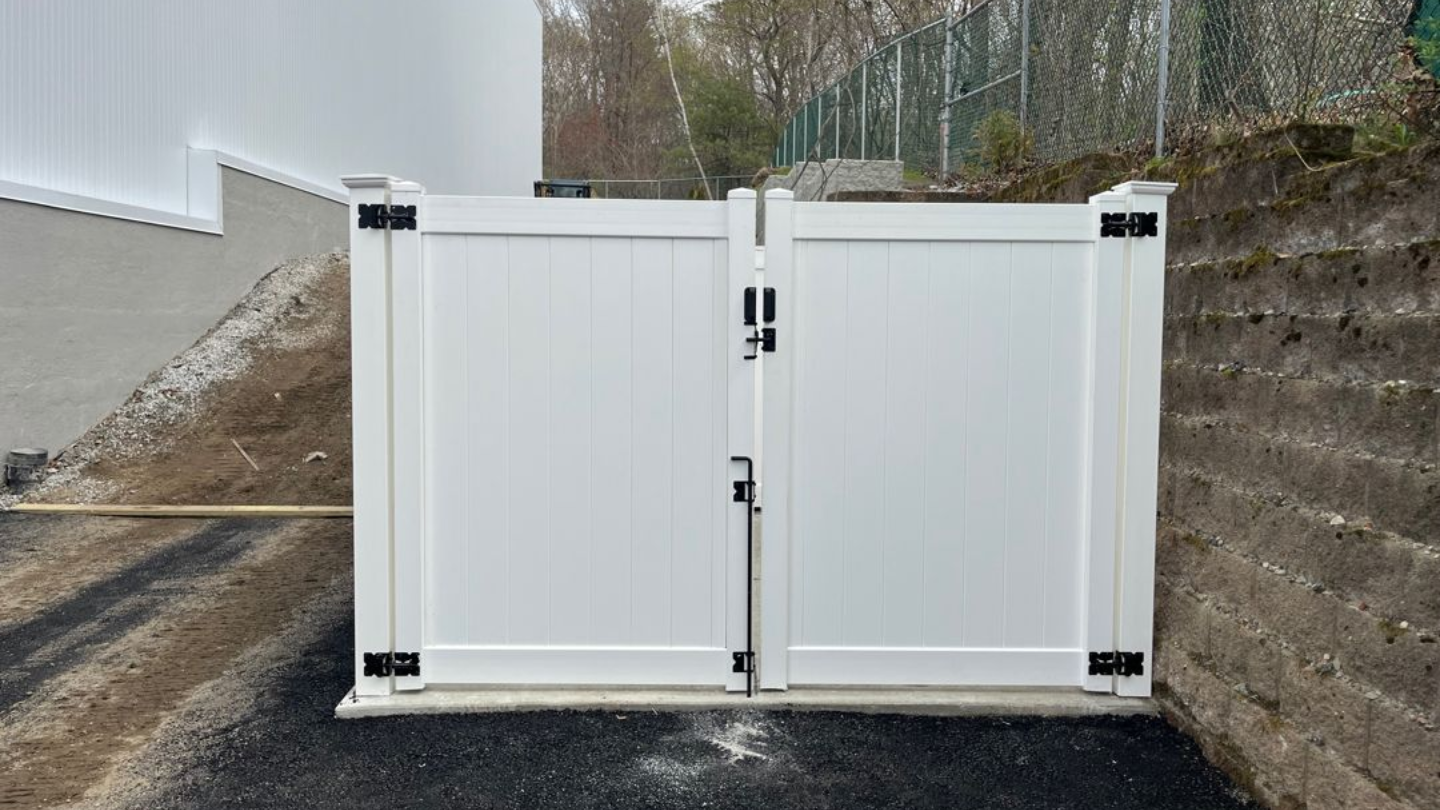 The commercial project below in Andover, MA features a full-coverage dumpster enclosure built with white vinyl privacy fence. Designed to keep waste areas completely out of sight, the enclosure is finished with a wide double gate and black hardware, providing easy drive-up access while maintaining a clean, professional appearance. It's a great example of how the right fencing solution can solve a practical problem without sacrificing curb appeal.
